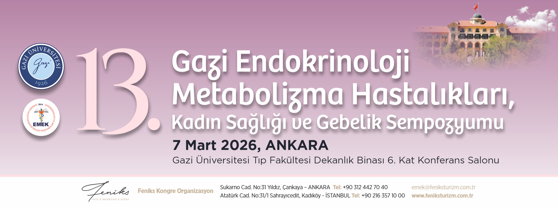 Uzun süredir devam eden ve artık geleneksel hale gelen “Endokrinoloji / Metabolizma Hastalıkları, Kadın Sağlığı ve Gebelik Sempozyumu” nun bu yıl on üçüncüsünü 7 Mart 2026 tarihinde gerçekleştirmek istiyoruz. Sempozyumumuzda kadının hayatında çok önemli bir yer alan gebelik sürecinde karşılaşılan endokrinolojik sorunlar dışında, yaşam boyu kadın sağlığı ve endokrinoloji ile ilgili konulara da yer veriyoruz. Ankara’mızın güzide eğitim kurumlarından alanında uzman konuşmacılarıyla yeni gelişmelere ışık tutma gayretinde olacağız. Her yıl olduğu gibi bu yıl da 8 Mart Dünya Kadınlar Günü’nü birlikte kutlayacağız. Hep beraber endokrinoloji ve kadın sağlığı ile ilgili birçok konuda kanıta dayalı tıp güncelini paylaşma şansı bulacağız.